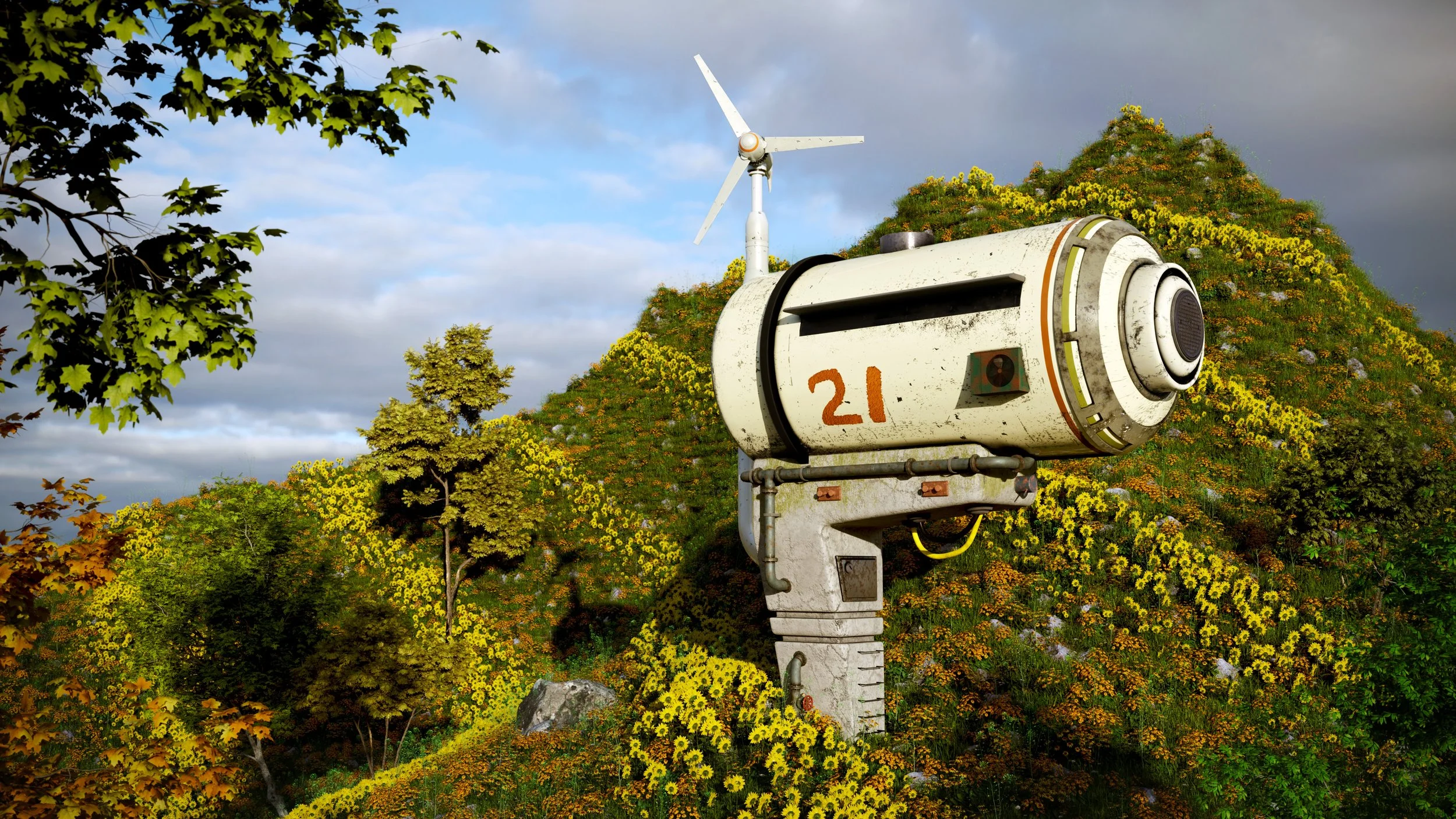 For the scene composition, the choice of elements was based on conveying the concept of an isolated location within an utopic Solarpunk world. The foliage bleeding into the foreground embraces the environment, aiming to highlight a sense of comfort and safety.